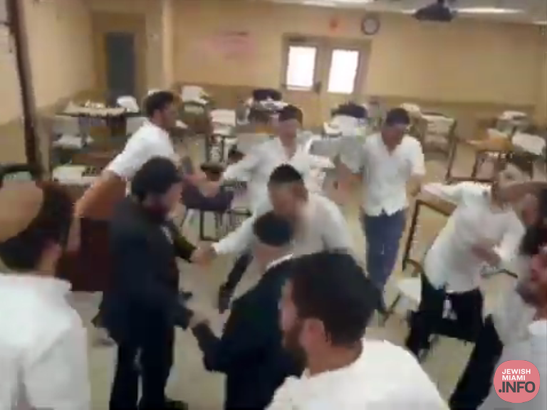 Hanholas Hayeshiva of Yeshiva Gedolah of Miami Rosh Yeshiva Rabbi Y. L. Schapiro, Menahel Rabbi Chaim Stern and Mashgiach Rabbi Bentche Korf together with the Bochurim dance on the news of the engagement of their longtime Talmid and now Mashpia in Yeshiva Gedolah Hatomim Sholom Bonnardel.