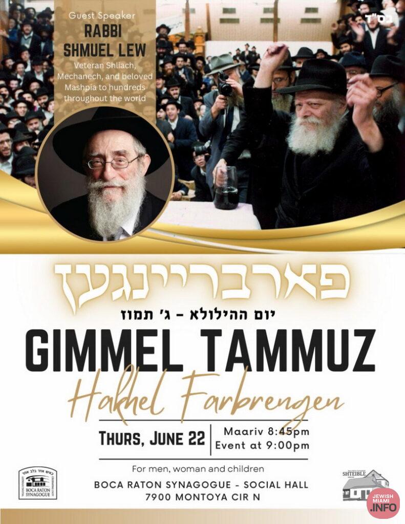 The Boca Raton Synagogue has invited Men, Women, and Children to join them for a Gimmel Tammuz Farbrengen marking the Yom Hillula of the Lubavitcher Rebbe with veteran Chabad Shliach Rabbi Shmuel Lew.