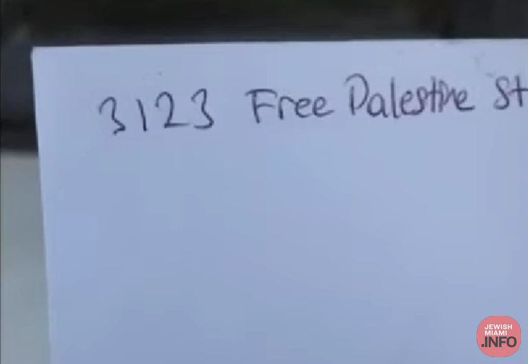 A letter, mailed to the Silverstone family at their Miami Beach residence on Prairie Avenue, bears a disturbing message from an unfamiliar sender on Free Palestine Street.