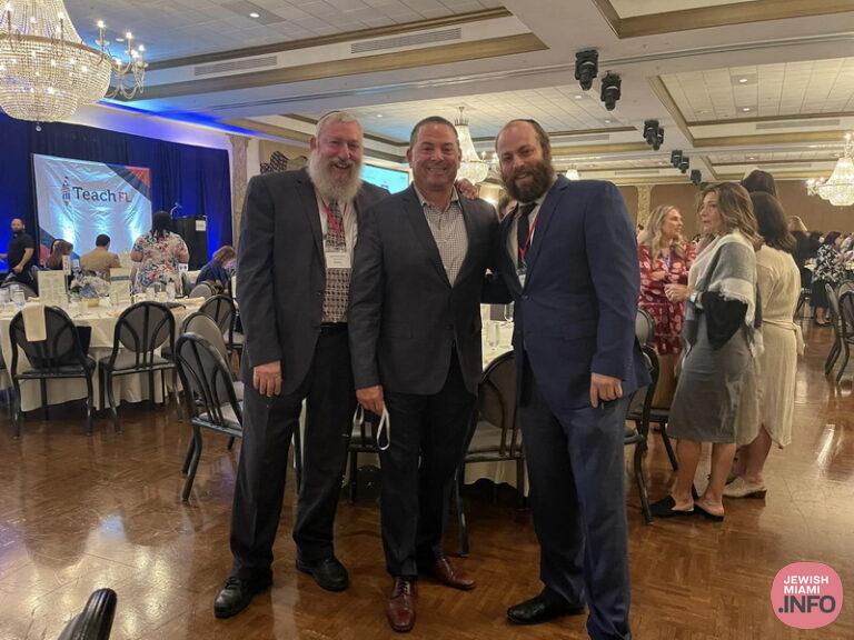 Rabbi Yossi Denberg and his son Rabbi Shloimy Denberg pose for a photo with Broward County Commissioner Michael Udine at the Teach Florida Legislative Breakfast. The Denbergs run the Lubavitch Hebrew Academy in Margate.