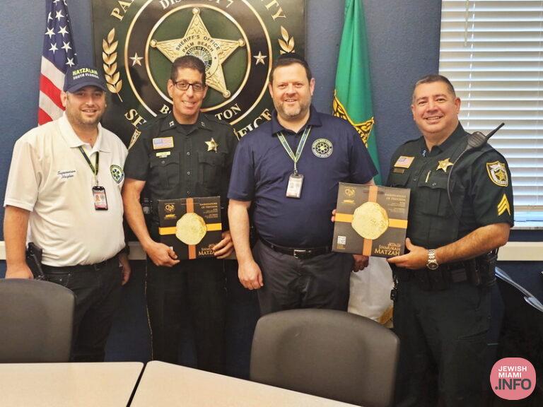 Two Hatzalah of South Florida Boca Raton Supervisors joined a pre-Pesach planning meeting with Captain Moss and Sergeant Ugalde of the Palm Beach Sheriff’s office. During their visit they presented them with a gift of Shmurah Matzah.