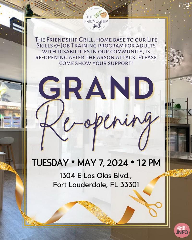 “The Friendship Grill, home base to our Life Skills & Job Training program for adults with disabilities in our community, is re-opening after the arson attack,” was the message posted to the Chabad of Las Olas Facebook account. “Please come show your support!”
