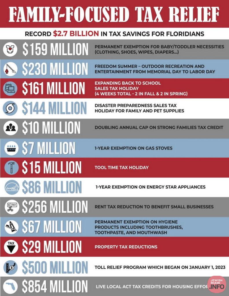 Governor Ron DeSantis signed the largest tax relief plan in Florida’s history today, providing Florida families with $2.7 billion in tax relief during the 2023–2024 fiscal year. The tax relief package includes a permanent exemption for baby and toddler necessities such as strollers, cribs, diapers, and baby wipes. Additionally, the tax relief package includes two back-to-school sales tax holidays lasting 14 days each, two disaster preparedness sales tax holidays lasting 14 days each, and a freedom summer sales tax holiday on recreational items and children’s toys that will last from Memorial Day to Labor Day.