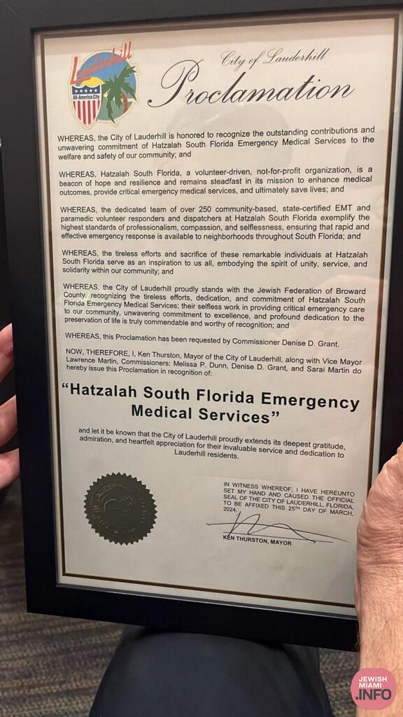 Hatzalah volunteers with Hatzalah South Florida were hand Monday to receive a proclamation of recognition from the City of Lauderhill noting the great work that Hatzalah has performed in their city.
