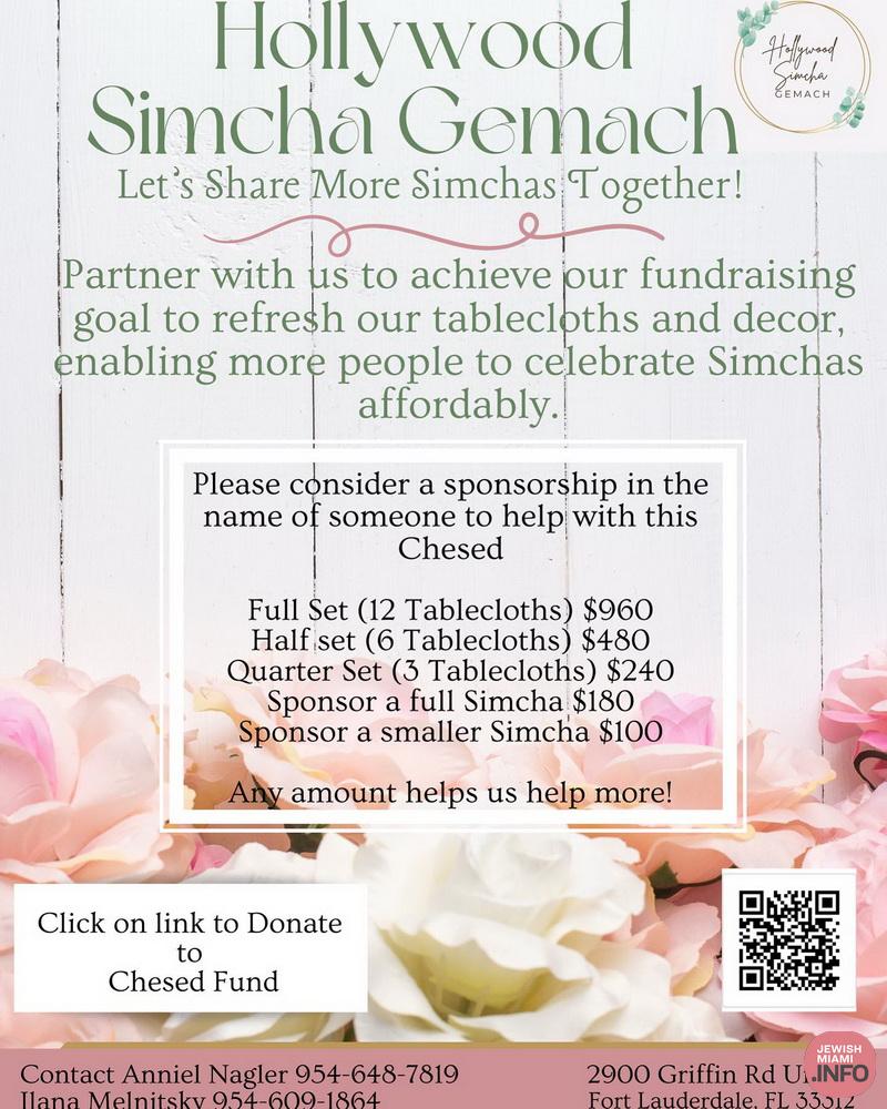 Please consider making a generous donation to this campaign to ensure that the Hollywood Simcha Gemach remains a vibrant and valuable asset of the South Florida Jewish community. The more we have, the more we can help others!