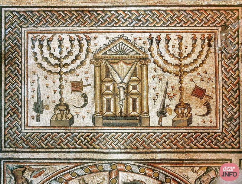 Evidence for both uses can be found in ancient art. In the mosaic, at the ancient synagogue in Hammat Tiberias, you can see a seven branched menorah made of stone with conical glass lamps at the tops of the branches. In a wall painting found in a house in Ostia, the port city of Rome, you can see men sitting around a table drinking from similar cups.