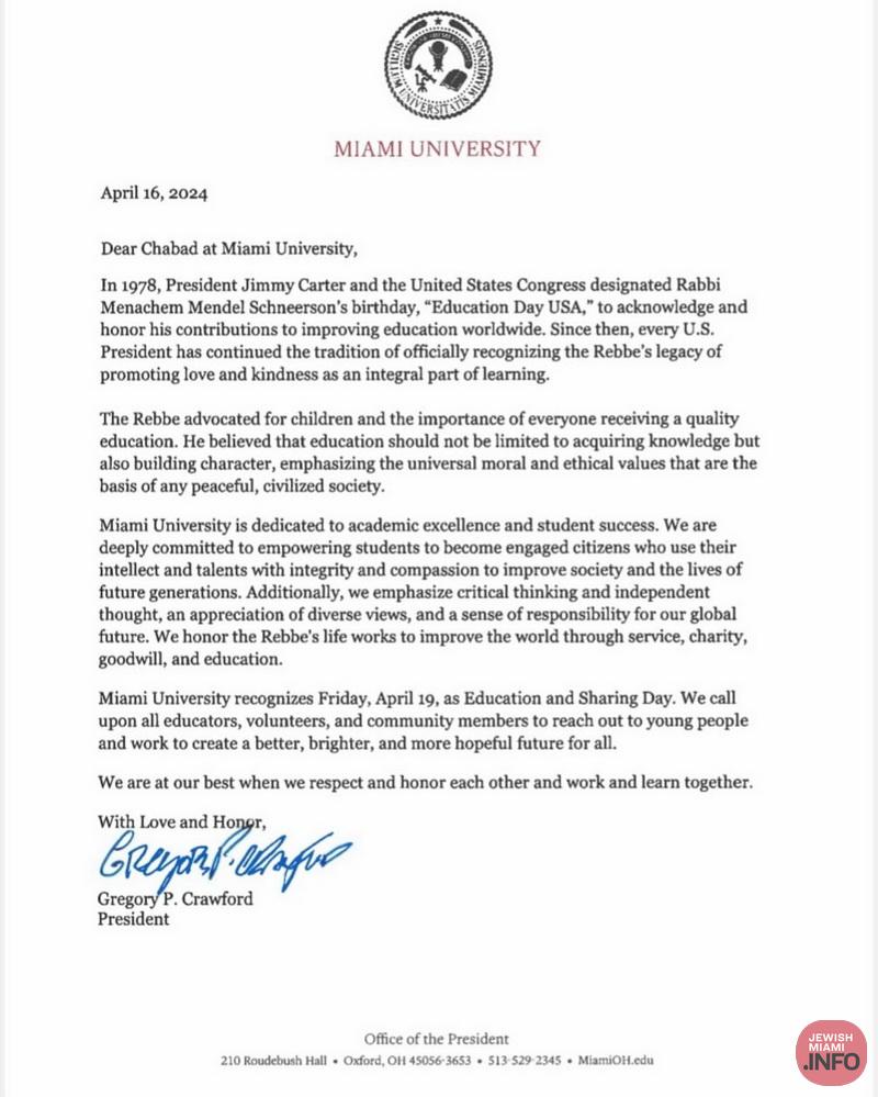 President of Miami University designates the Lubavitcher Rebbe’s birthday, the 12th of Nissan, as Education Day USA.