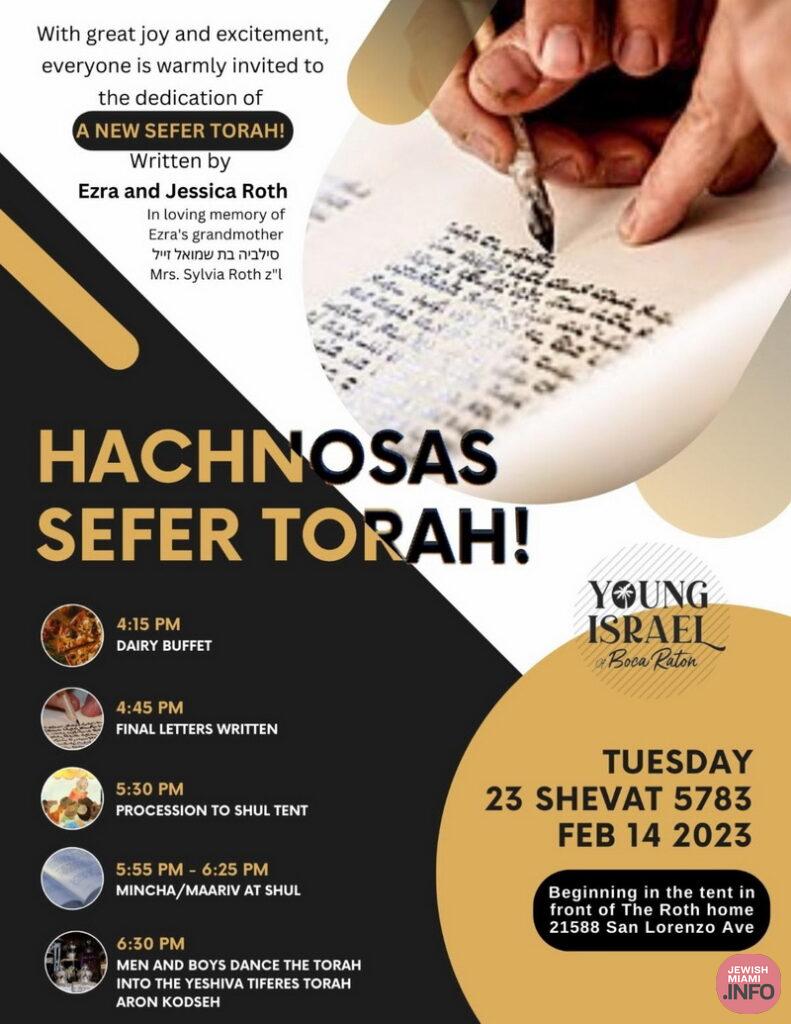 The completion will take place on Tuesday, Feb. 14th, the 23rd of Shvat beginning at the Roth home before proceeding to The Young Israel of Boca Raton. The event will include a buffet, singing and dancing, and a grand procession.